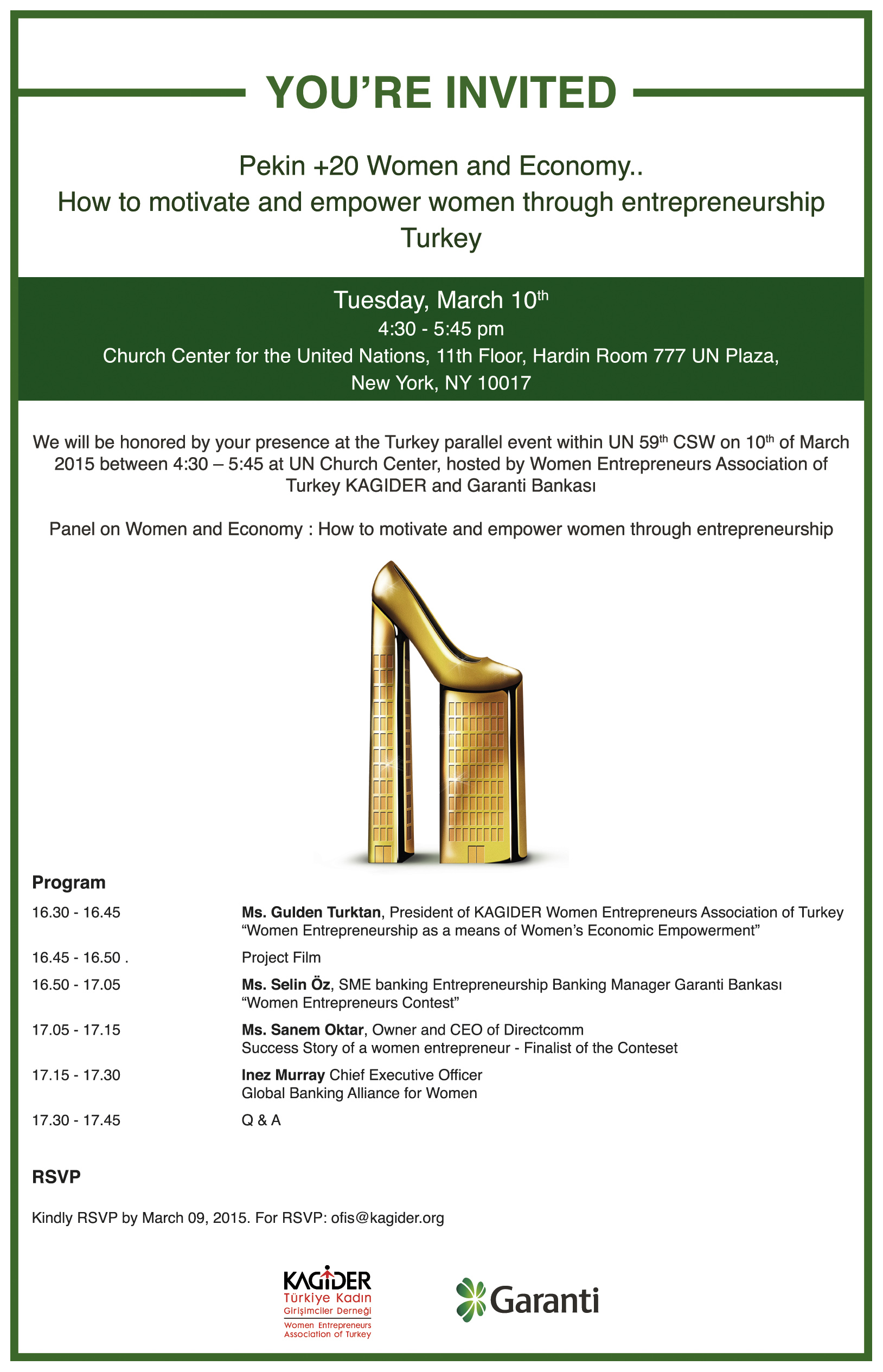 Birleşmiş Milletler 59. Kadının Statüsü Komisyonu etkinlikleri çerçevesinde, Türkiye Kadın Girişimciler Derneği (KADİGER) ve Garanti Bankası tarafından, 10 Mart 2015 Salı günü, 16.30-17.45 saatleri arasında, UN Church Center’da düzenlenecek olan Kadın ve Ekonomi: Türkiye’de Girişimcilik ile Kadını Destekleme ve Güçlendirme Paneli’ne ilişkin duyuru ektedir.