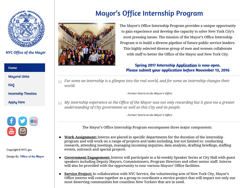 New York Belediyesi’nin 2017 Bahar Dönemi Staj Programı için başvurular 13 Kasım 2016 tarihine kadar devam etmektedir. Ayrıntılı bilgiye https://a002-oom03.nyc.gov/nycmointernship/index.html