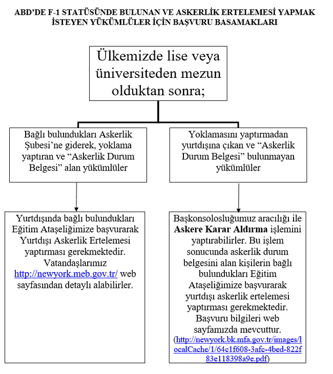 F1 vizesi ile ABD’de bulunan yükümlülerden yoğunlukla alınan sorular üzerine, Askerlik işlemlerine ilişkin izlenmesi gereken ilk basamaklarekte sunulanşemada açıklanmıştır. Şemadan yola çıkılarak, başvuru sahibinin durumuna göre belirlenecek yöntem doğrultusunda veilgili bilgi notumuz çerçevesinde başvuru yapılması rica olunur.
